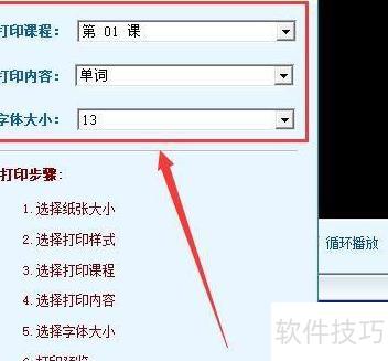 4、 在打印卡片窗口右侧,选择打印课程、打印内容及字体大小,所示...