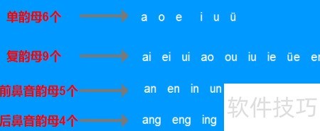 2、 韵母共分四类:单韵母、复韵母、前鼻音韵母和后鼻音韵母。