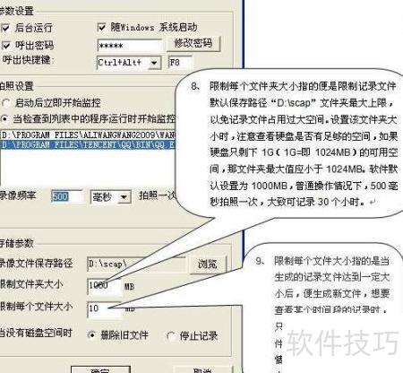 7、 限制每个文件夹的大小,是指设定记录文件默认存储路径D:scap文件夹的最大容量,防止因文件过多占用过多磁盘空间。设置时需先检查硬盘剩余空间,若可用空间仅剩1GB(即1024MB),则应将文件夹上限设为小于1024MB的数值。软件默认值为1000MB,在常规使用条件下,以每500毫秒拍摄一张图片的速度计算,大约可连续记录30小时的数据内容。合理设置有助于平衡存储与使用需求。