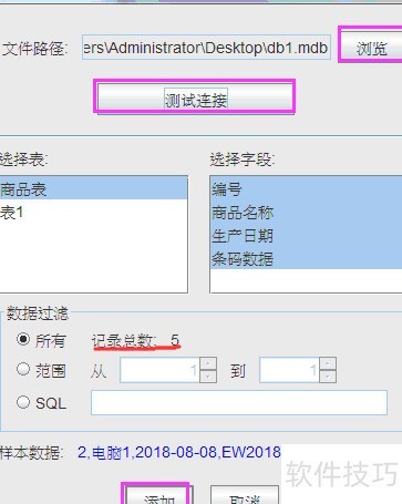 1、 使用条码打印软件连接Access数据库时,首先创建一个空白标签,接着通过数据库工具添加Access数据源。浏览并选择目标数据库文件后,进行连接测试。确认连接成功后,选取所需的数据表,默认会导入表中全部字段,同时可查看该表包含的数据记录数量。
