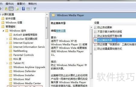 5、 运行gpedit.msc,进入组策略,依次展开管理模板、Windows组件、Windows Media Player,启用防止媒体共享策略以禁用共享功能。