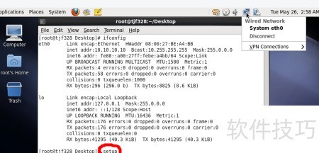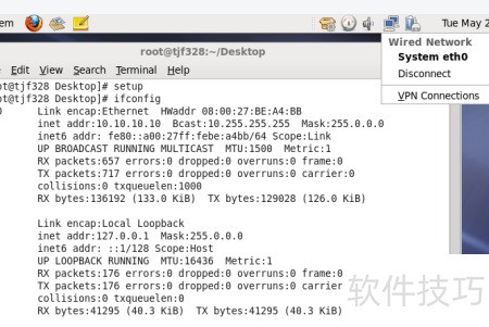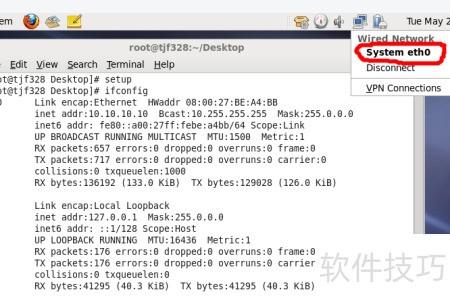 4、 配置完成后,右上角将显示system eth0,可在控制台输入ifconfig命令进行验证。