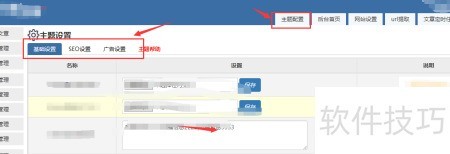 6、 点击后台右上角导航栏的主题配置,由于使用他人模板,需对原始主题参数进行相应调整。