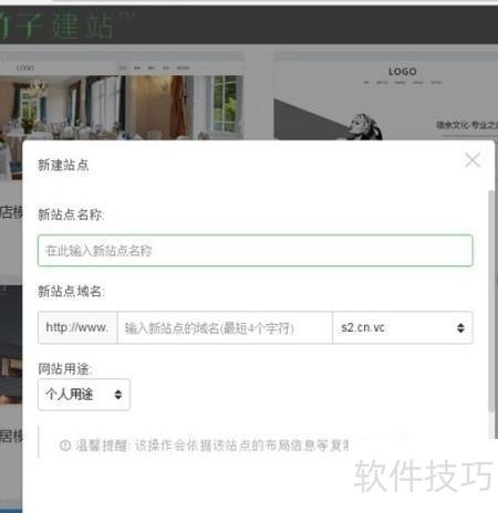 3、 选择模板后,点击立即使用,即可跳转至新建站点页面。