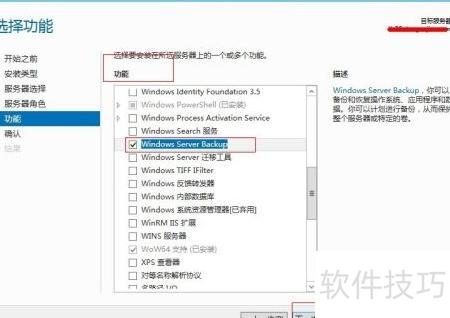 6、 在功能列表中搜索Windows Server Backup,找到后选中该选项即可。