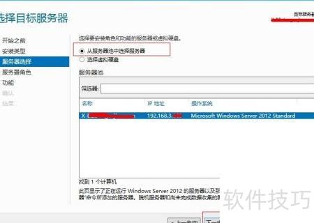 5、 选择从服务器池中选取服务器,浏览并选定目标服务器后,点击下一步继续操作。