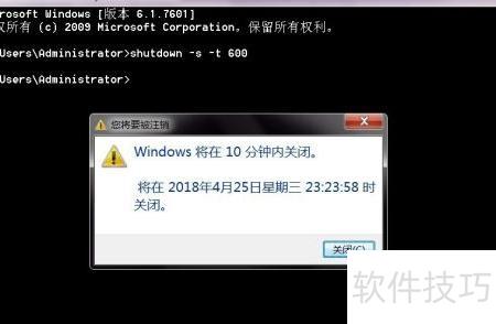 5、 可使用秒数倒计时关机功能,例如设置10分钟即600秒,只需输入 shutdown -s -t 600 后按回车确认执行,注意命令间保留空格。