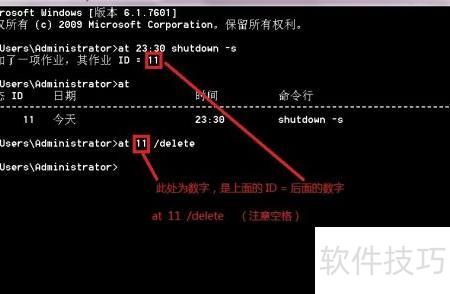 4、 取消定时关机只需执行命令 at ID /delete,按回车即可。其中ID为对应任务编号,例如输入 at 11 /delete 即可删除该定时关机任务。