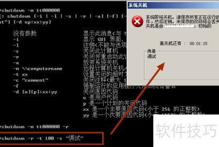2、 例如输入命令shutdown -r -t 100 -c 调试,系统将弹出重启提示窗口。其中,-r表示重启,-t 100指等待100秒后执行,-c 调试为备注信息,用于说明操作原因。