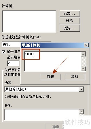 8、 点击添加按钮,输入计算机名如tt000后确认。