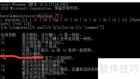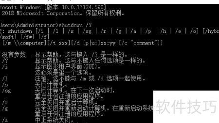 3、 在命令提示符中输入 shutdown /?并按回车,光标位置将显示该命令的详细帮助信息。
