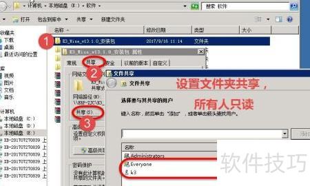 2、 右键点击要共享的文件夹,选择属性,进入共享选项卡,点击共享按钮,将权限设置为所有人只读。对每个需共享的文件夹重复上述步骤,完成只读权限配置。