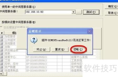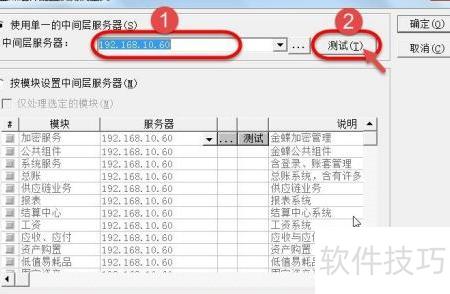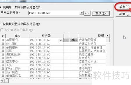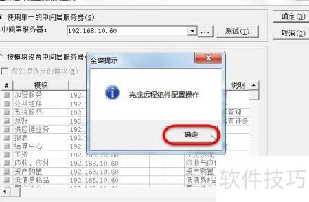 18、 打开组件配置工具,输入中间层服务器地址192.168.10.60,然后点击测试按钮进行连接检测。