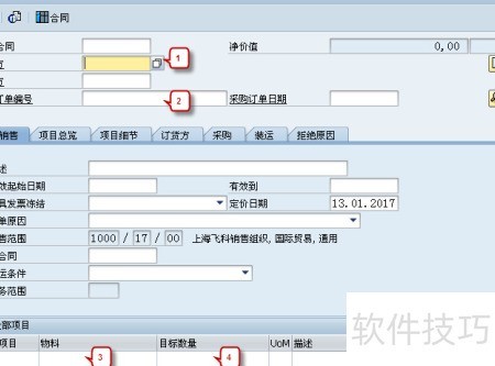 5、 进入界面后可查看外贸合同概览,填写售达方、采购订单号、物料编号、目标数量、贸易条款及净价等信息。