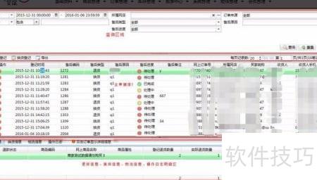 5、 售后登记分为三个部分:查询区域、主单信息区域,以及包含退货、换货、物流和操作日志的详细信息区域。