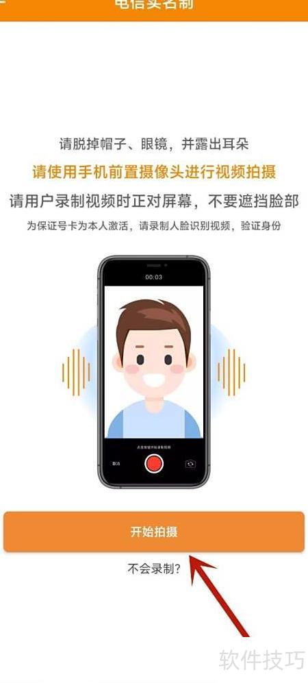 12、 进入电信实名页面,查看提示后点击拍摄,按要求完成认证流程。