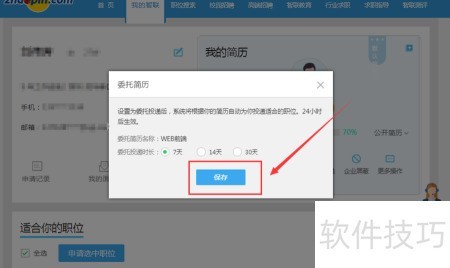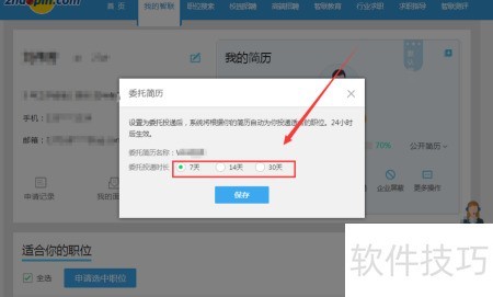 4、 弹出委托简历窗口,选择委托投递时长,所示。
