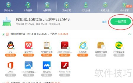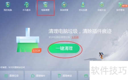 2、 在软件界面顶部点击电脑清理,再选择下方一键清理按钮,系统随即开始自动清理。