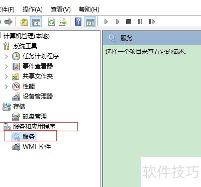 2、 打开计算机管理,选择左侧服务与应用程序中的服务选项。