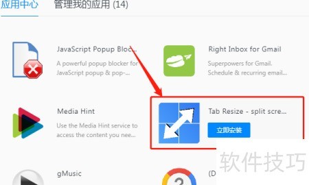 3、 安装后,在Tab Resize说明页面可见,此插件能调节当前及右侧选项卡的窗口尺寸。