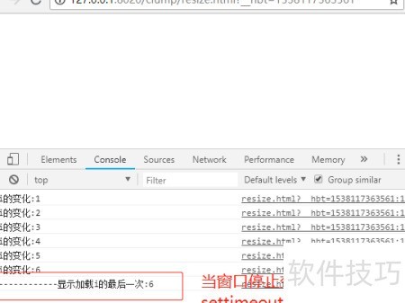4、 保存HTML文件后,用浏览器打开,按F12进入开发者工具,切换到Console面板,调整浏览器窗口大小,即可在控制台中看到setTimeout内的内容被输出。