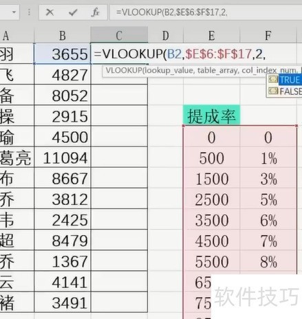 2、 第二个参数需从提成率表中选取第三个值,并使用F4键进行绝对引用。