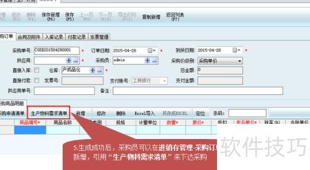 4、 在进销存管理中,通过采购订单关联生产物料需求清单,完成下单、材料入库及付款流程。