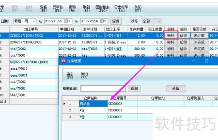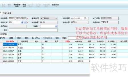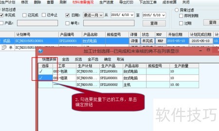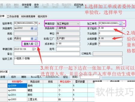 5、 下发加工单后,可在新版ERP系统中通过加工单界面一键完成领料与验收操作,快速选定仓库,自动扣减原材料库存,并将成品直接入库。