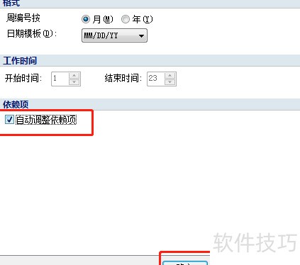 4、 进入进度计划,选择依赖项,勾选自动调整选项,确认后完成设置。