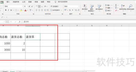2、 打开Excel,新建退货率表格,填入采购总数与退货数量数据。