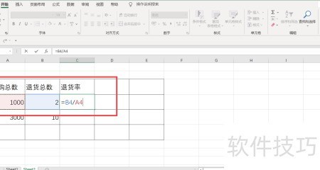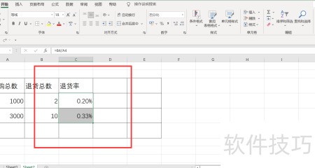 在Excel中新建表格,录入相关数据,输入退货率计算公式,将结果设置为百分比格式,具体操作步骤如下所示。