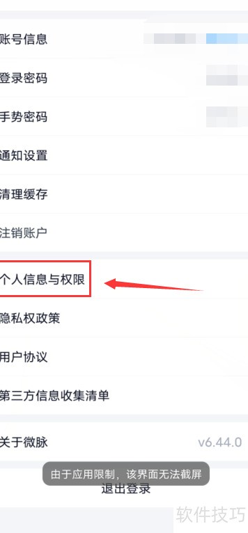 2、 打开微脉应用,进入设置,选择个人信息与权限选项。
