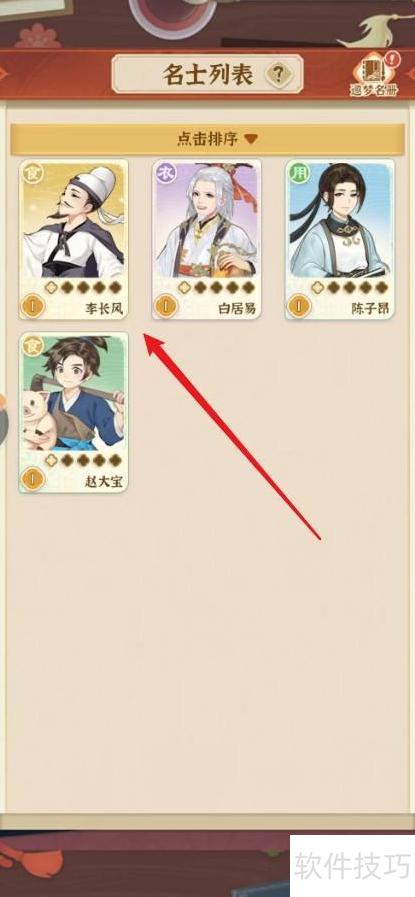 4、 进入名士列表,选择李长风。