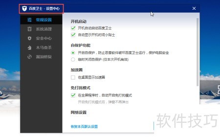 2、 进入菜单,点击设置中心,即可打开百度卫士的设置界面。