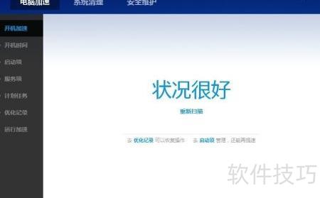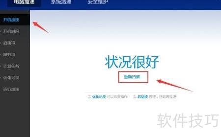 4、 点击左侧开机加速,选择重新扫描进行加速优化。