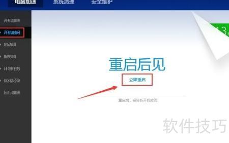 11、 点击左侧开机时间,选择立即重启,重启后即可查看电脑启动时长。