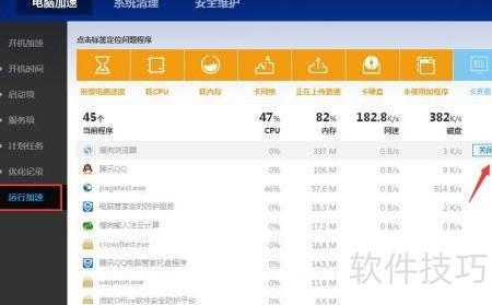 10、 点击左侧运行加速,查看所有运行程序,选择目标程序后点击关闭即可终止其运行。