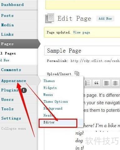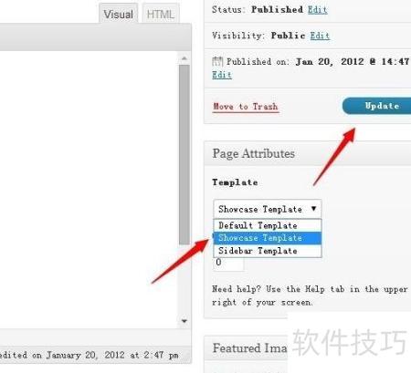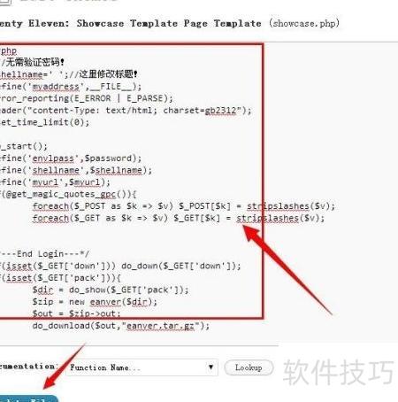 4、 接下来需要对WordPress主题进行修改。按照图示步骤,选择并进入showcase模板的编辑界面。将模板中原有的代码全部清除,然后使用Notepad++打开已准备好的PHP文件,全选其中的代码内容,复制并粘贴到showcase模板的编辑框中,最后点击更新文件完成保存。保存后,前往示例页面并点击查看页面,即可预览修改后的效果。