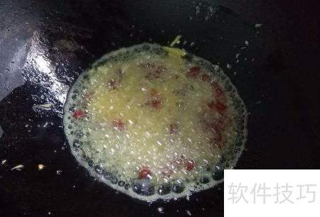 2、 将300克购回的九筒火锅底料倒入锅中,用小火缓缓翻炒至完全融化。