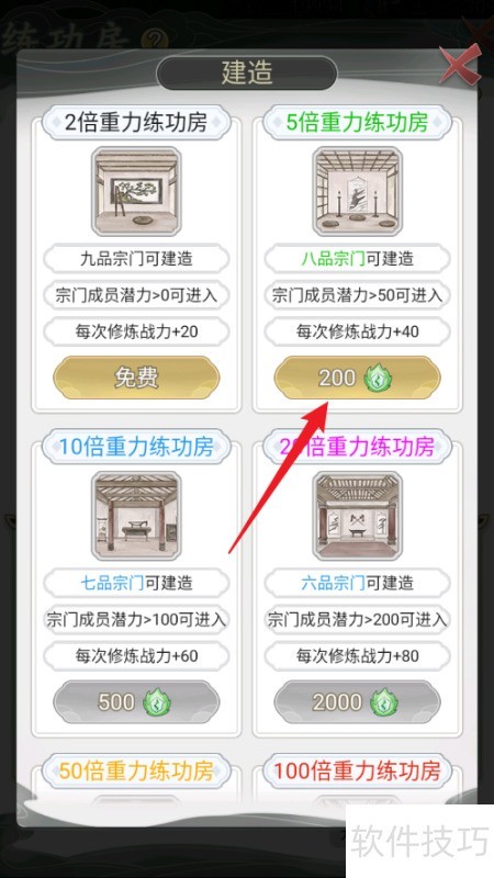 6、 进入建造界面,选取五倍重力修炼室并消耗灵石即可完成建设。