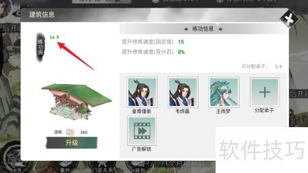 2、 进入练功房,点击升级按钮进行提升。