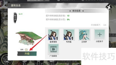 4、 进入练功房,点击升级按钮。