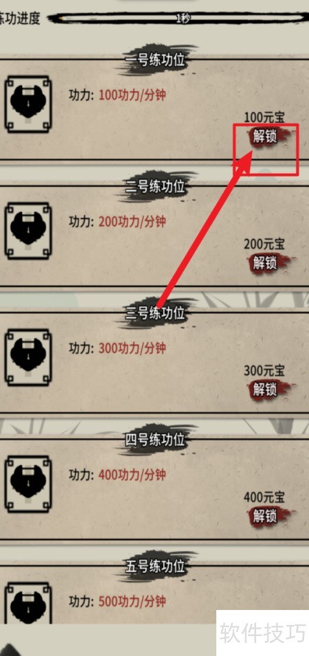 3、 进入练功房页面后,点击底部解锁图标即可开启练功房功能。