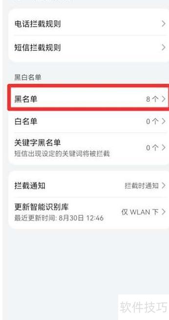2、 进入黑名单选项,在拦截规则中再次点击黑名单。