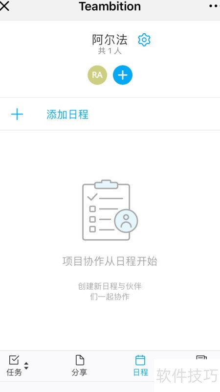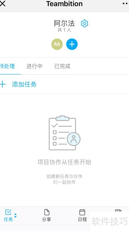 2、 进入项目详情页后,底部显示任务、分享、日程和文件等操作选项。