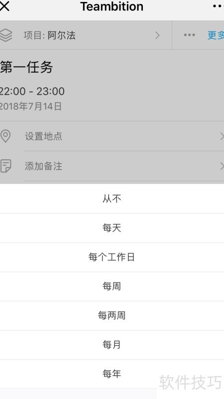 5、 添加日程后将直接进入详情页面,除原有标题、起止时间和项目名称外,还可补充地点、备注,并设置重复规则,如每日、每周等循环方式,具体如下: