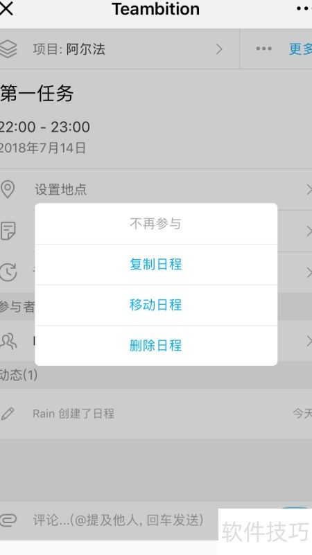 6、 在日程详情页面右上角点击更多按钮,即可进入操作界面,支持复制、移动和删除日程。