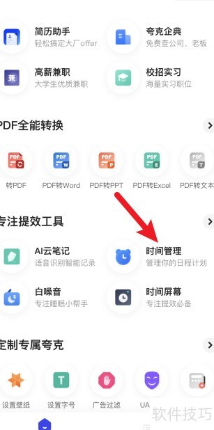 1、 进入夸克主页,找到AI应用,选择专注提效中的时间管理功能即可。