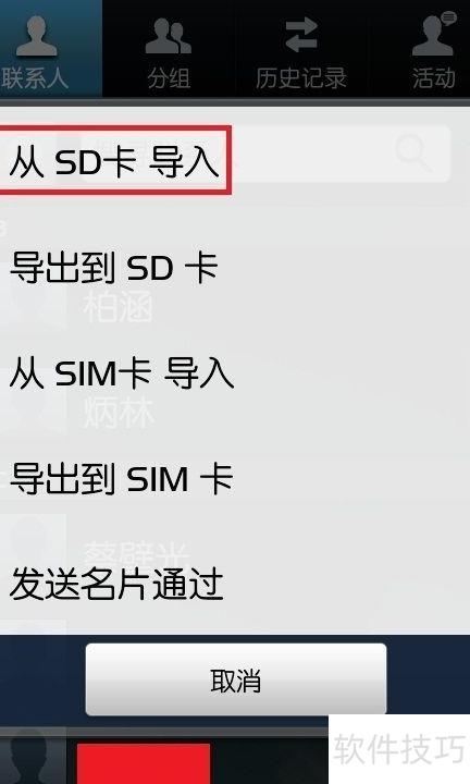 2、 将之前导出的通信录文件复制到手机内置SD卡,然后按下菜单键,打开通信录编辑选项,示导入00001.vcf文件即可完成操作。