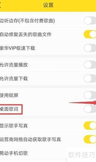 3、 向右滑动桌面歌词的开关按钮,完成操作后即可启用桌面歌词功能。